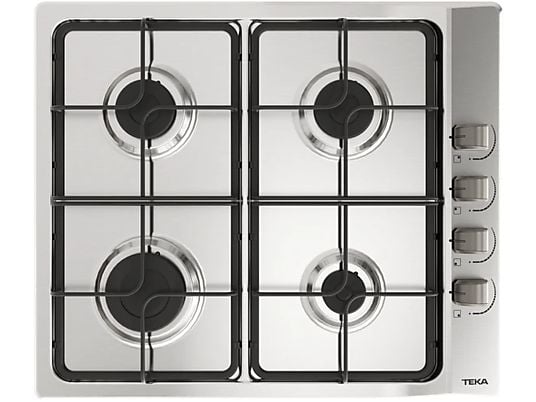 Placa de gas Teka de 60 cm con 4 quemadores y funcionamiento a gas natural. Fabricada en acero inoxidable con parrillas esmaltadas resistentes, mandos laterales ergonómicos y sistema de seguridad con desconexión automática. Potencia total de 7500 W, ideal para cocinar con rapidez y precisión.