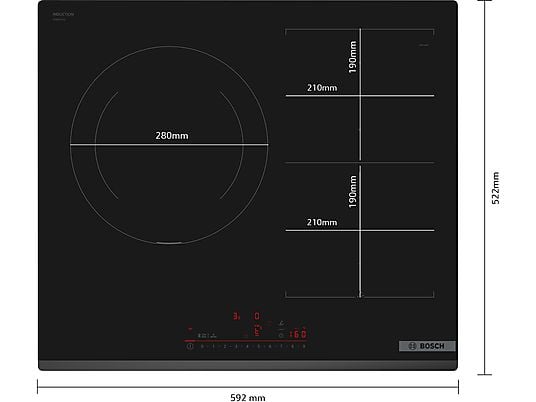 La placa de inducción Bosch PID61RBB5E de 60 cm ofrece 3 zonas de cocción, incluyendo zona grande de 32 cm, 17 niveles de potencia y control táctil TouchSelect para un manejo preciso. Incorpora función Sprint para calentamiento rápido, inicio automático, temporizador programable y bloqueo infantil para una cocina segura y eficiente.