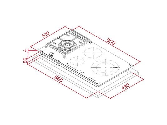 - Placa híbrida con 3 zonas de inducción y 1 zona de gas natural.