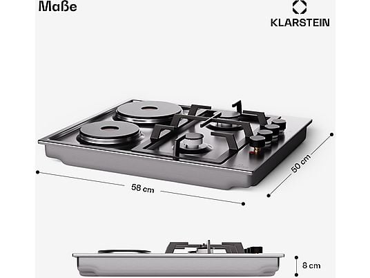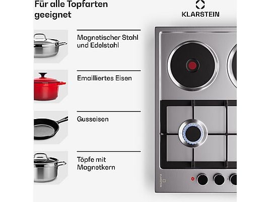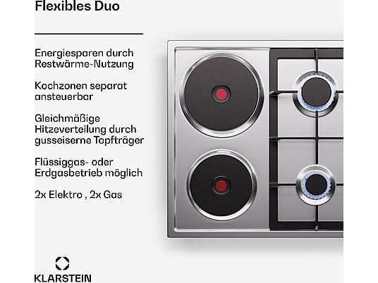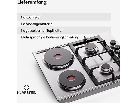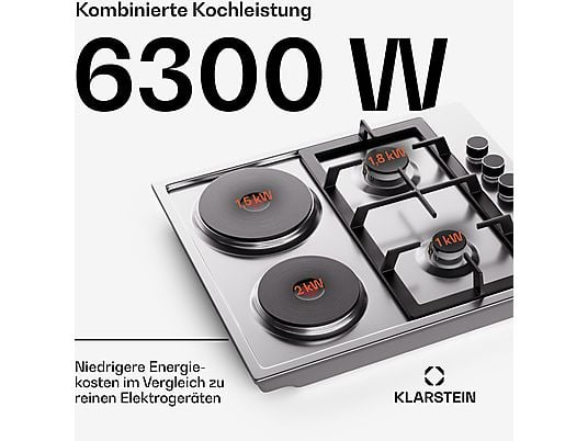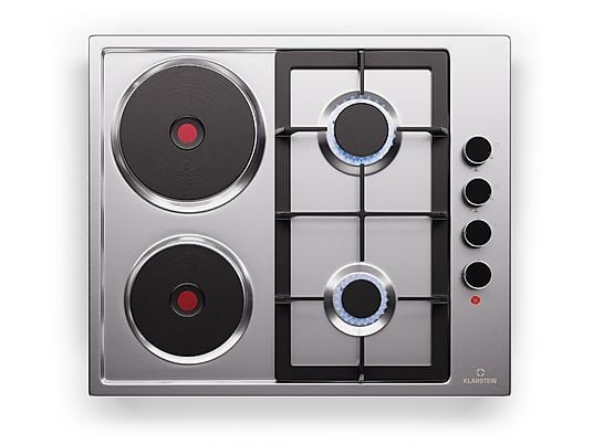 Placa Mixta Gas + Eléctrica Klarstein MultiChef 4, 4 Zonas (2 Gas + 2 Eléctricas), 6300 W, Encendido Automático, 58 cm, Acero Inoxidable