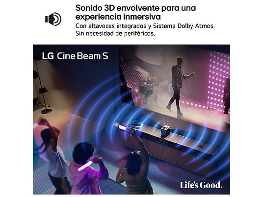 El LG CineBeam S PU615U también incorpora altavoces integrados compatibles con Dolby Atmos, proporcionando un sonido envolvente sin necesidad de altavoces externos.