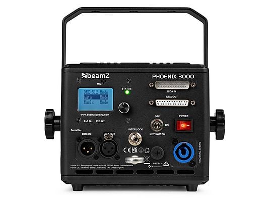 El BeamZ Phoenix 3000 es extremadamente versátil y puede ser controlado mediante DMX (10 o 34 canales), en modo automático con patrones preprogramados, o por sonido. Los usuarios avanzados pueden aprovechar la compatibilidad ILDA, conectándolo a un PC o software de control vía DB25 para crear espectáculos completamente personalizados. También incluye un práctico mando a distancia para control directo.
