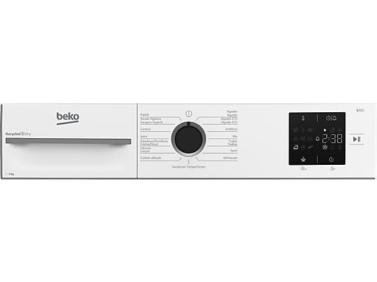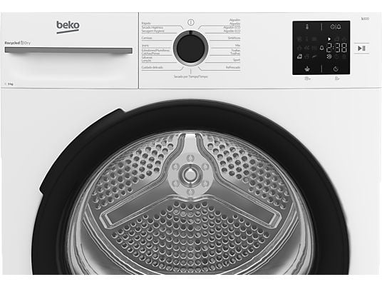 Secadora Beko BM3T39220WB de bomba de calor, 9 kg de capacidad y 15 programas, con tecnologías OptiSense® y AquaWave®, función antiarrugas, display digital e iluminación interior, en color blanco.