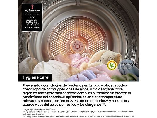 Con el programa Hygiene Care+, la secadora elimina bacterias, ácaros y alérgenos mediante aire caliente a alta temperatura, permitiendo desinfectar tanto prendas mojadas como secas, incluso peluches o textiles delicados.