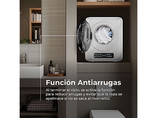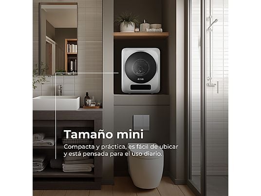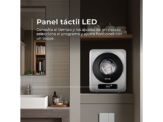 Secadora portátil EVVO Mini S3 de 3 kg, 5 programas, sensor de humedad y modo Airfresh. Compacta, eficiente y perfecta para espacios pequeños.