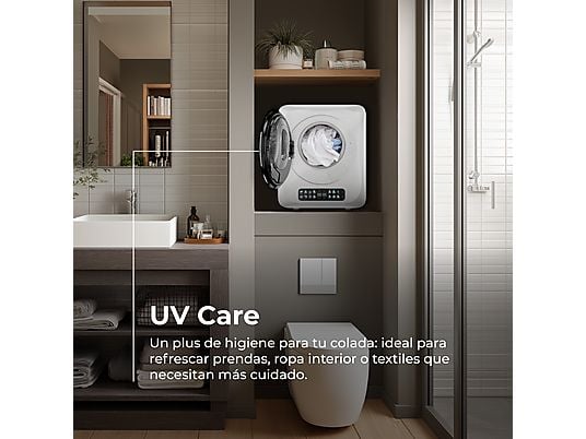 Higiene UV Care: Esterilización con luz ultravioleta ajustable entre 30 y 60 minutos, para eliminar bacterias de la ropa de manera segura.