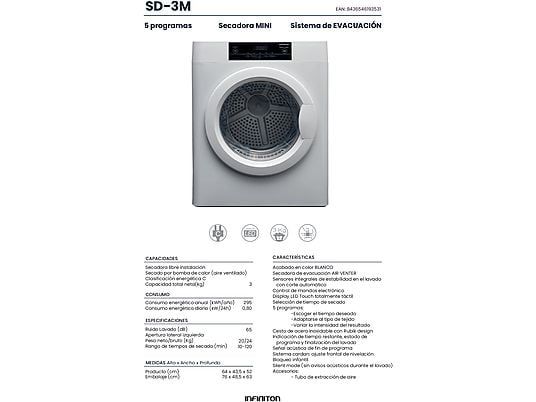 Secadora INFINITON SD-3M de 3 kg, 5 programas, carga frontal y control LED. Compacta, eficiente (C) y con bloqueo infantil para mayor seguridad.