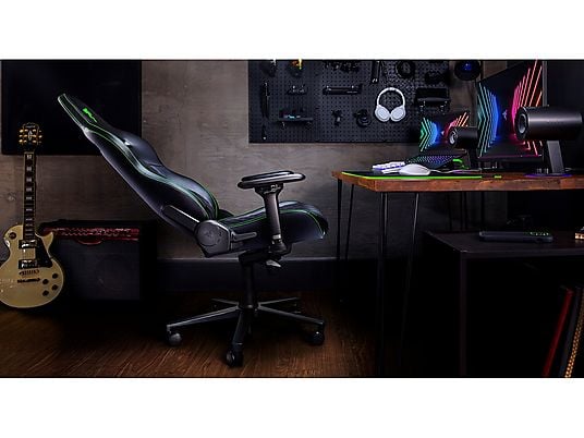 Silla Gaming Razer Enki X, Negro/Verde. Reposabrazos 2D, reclinable hasta 152°, cuero sintético y tela afelpada. Soporta hasta 136 kg y proporciona ergonomía premium para largas sesiones de juego.