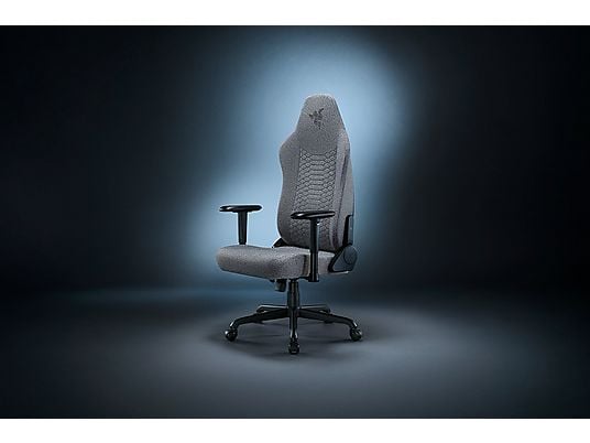 Silla Gaming Razer Iskur V2 X en gris claro con soporte lumbar integrado, reposabrazos 2D ajustables y respaldo reclinable hasta 152°. Diseño ergonómico y capacidad de hasta 136 kg.