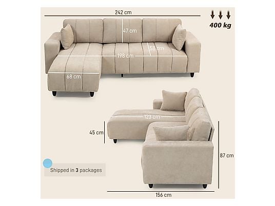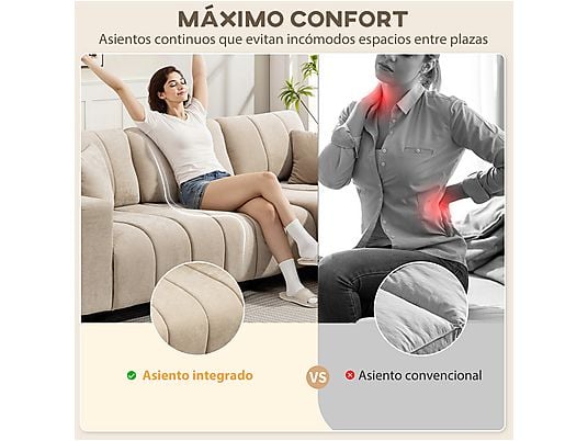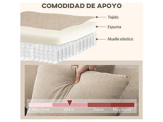 El sofá esquinero HOMCOM combina confort, versatilidad y diseño elegante. Su chaise intercambiable se adapta a cualquier distribución, mientras que el cojín continuo, muelles ensacados y espuma de alta resiliencia ofrecen una sentada cómoda y envolvente. Tapizado en lino sintético beige, incluye dos almohadas y reposabrazos multifuncionales.