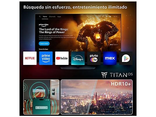 Su sistema operativo Titan OS proporciona un entorno Smart TV intuitivo y rápido, con acceso directo a las principales aplicaciones de streaming como Netflix, YouTube, Disney+, HBO y Amazon Prime Video. La navegación es fluida, y con compatibilidad con Matter Smart Home, puedes controlar funciones del televisor mediante aplicaciones o por voz a través de altavoces inteligentes como Alexa o Google Assistant.