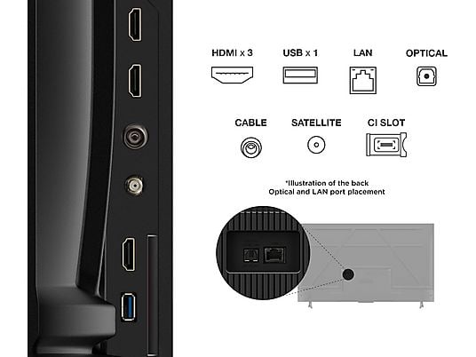En conectividad, cuenta con 3 puertos HDMI, 2 USB, WiFi y Bluetooth, permitiendo conectar fácilmente consolas, barras de sonido y otros dispositivos. Su diseño elegante en color negro la convierte en una opción versátil para cualquier hogar.