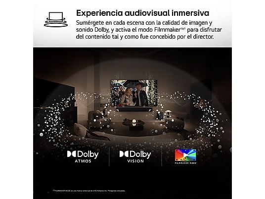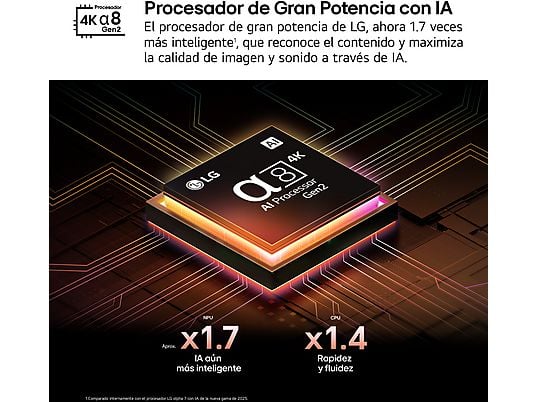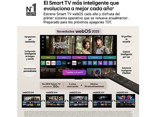 El sistema operativo webOS Smart TV ofrece una experiencia fluida e intuitiva, con acceso a las principales plataformas de streaming y funciones inteligentes que evolucionan con el tiempo. Incluye el mando Magic Remote, con puntero y control por voz, facilitando la navegación y el control del hogar conectado.