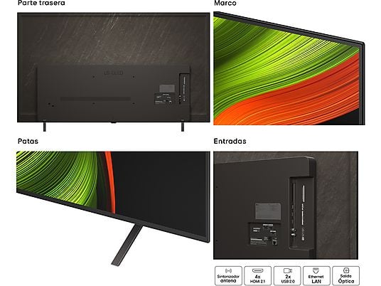 A nivel de conectividad, dispone de 4 puertos HDMI (compatibles con HDMI 2.1), 2 USB, Wi-Fi y múltiples sintonizadores (DVB-T2, DVB-S2, DVB-C), asegurando compatibilidad total con dispositivos externos y emisiones actuales.