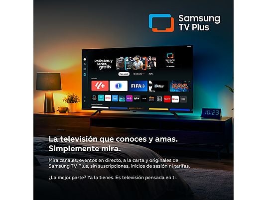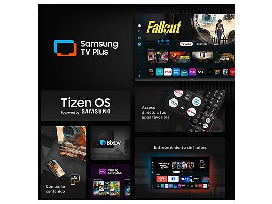 El sistema Tizen OS 8.0 permite acceder fácilmente a plataformas como Netflix, YouTube, Disney+, Prime Video o Movistar+, además de servicios como Samsung TV Plus (televisión gratuita por streaming) y Samsung Gaming Hub, que abre la puerta al gaming en la nube. Todo ello acompañado de Bixby, el asistente de voz que facilita el control del televisor de forma rápida y sencilla.