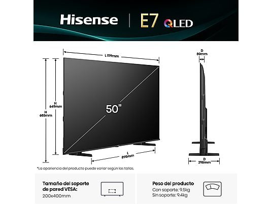 TV QLED 50" Hisense 50E7Q, UHD 4K, AI Upscaler, Dolby Atmos & DTS:X, VIDAA Smart TV, HDMI 2.1, Negro