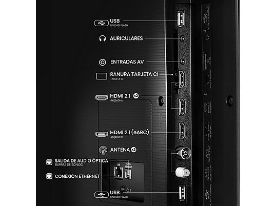 El sistema operativo VIDAA Smart TV ofrece una navegación rápida e intuitiva, acceso a aplicaciones como Netflix, Prime Video o YouTube, y compatibilidad con asistentes de voz como Alexa. En conectividad, destaca por sus 4 puertos HDMI 2.1, 2 USB, Wi-Fi y Bluetooth, facilitando la conexión con consolas, barras de sonido y otros dispositivos.