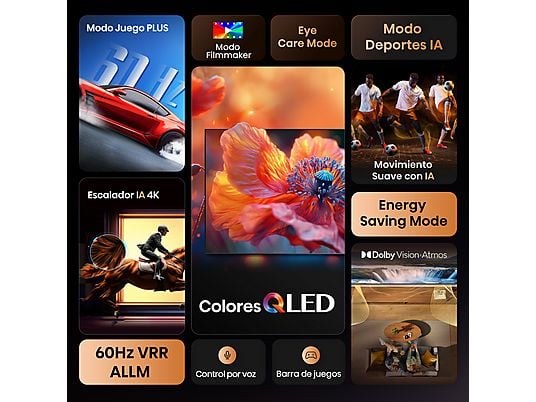 En el apartado de imagen, la tecnología QLED proporciona colores más vivos, precisos y realistas, mientras que la compatibilidad con HDR10 y HDR10+ mejora el rango dinámico para ofrecer escenas con mayor profundidad y contraste.