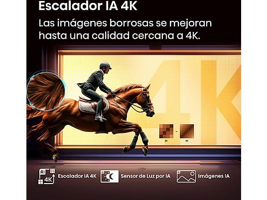 Gracias a su sistema AI 4K Upscaling, este televisor analiza cada fotograma en tiempo real para mejorar la calidad de imagen, ajustando automáticamente el brillo, contraste y nivel de detalle incluso en contenidos que no están en 4K. Además, el sensor de luz inteligente (AI Light Sensor) adapta la imagen según las condiciones de iluminación de la sala, garantizando siempre una visualización óptima.