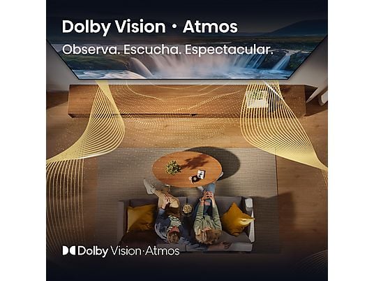 El sonido también destaca gracias a la integración de Dolby Atmos y DTS:X, creando una experiencia envolvente en 3D que mejora diálogos, efectos y ambientación. Con una potencia de 14 W, ofrece un audio equilibrado ideal para todo tipo de contenidos.