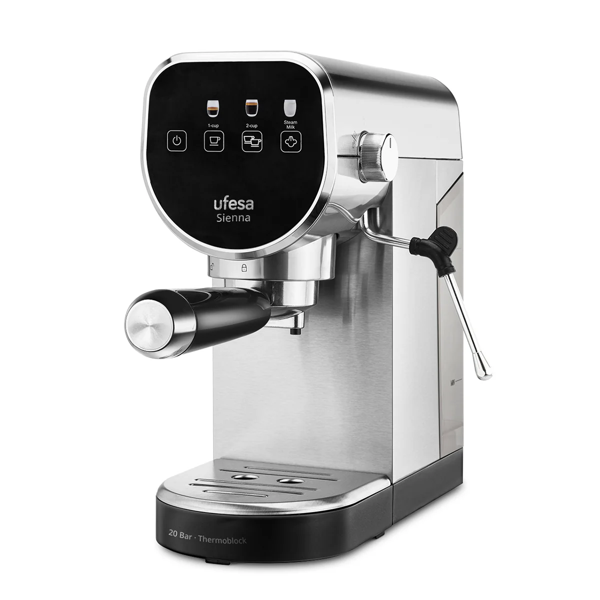 Cafetera express Ufesa Sienna de 20 bares y 1360W con sistema Thermoblock, vaporizador orientable y depósito de 0.9L. Compatible con café molido y monodosis ESE. Ideal para preparar espresso, cappuccino y más en casa con rapidez y facilidad.