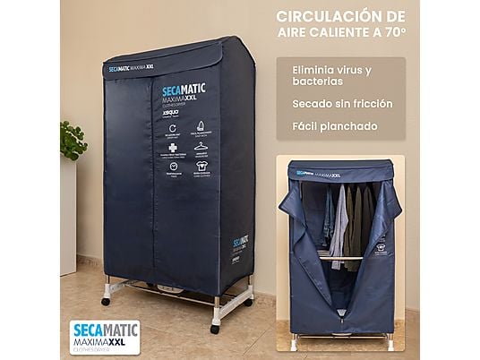 Secadora portátil XSQUO Secamatic Máxima XXL 1200W con capacidad 20 kg, temporizador, ruedas y funda protectora. Secado rápido y sin arrugas.
