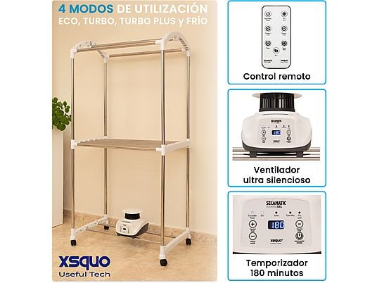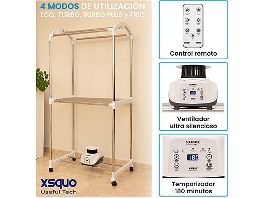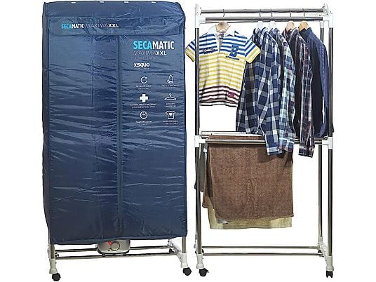 La XSQUO Secamatic Máxima XXL es una potente secadora portátil tipo tendedero diseñada para ofrecer un secado rápido, eficiente y cuidadoso con tu ropa. Gracias a su sistema de flujo continuo de aire caliente, seca las prendas sin fricción, evitando el desgaste y prolongando su vida útil.
